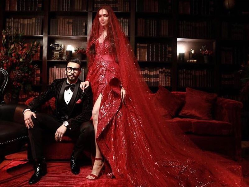 ارتدت الممثلة الهندية ديبيكا بادكون فستان مذهل باللون الأحمر القرمزي مع طرحة طويلة من نفس اللون في حفلة الإستقبال الخاصة بزواجها وكانت الإطلالة من تصميم زهير مراد المصمم اللبناني الشهير.