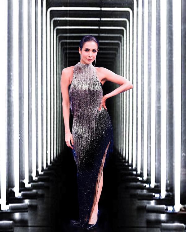 تألقت عارضة الأزياء والممثلة الهندية ماليكا أرورا بفستان سهرة مستوحى من الثمانينات باللونين الفضي والاسود من مجموعة المصمم الكويتي يوسف الجسمي.