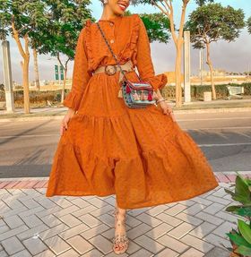اعتمدت هنا العارضة علي تلك الدرجة من اللون البرتقالى والتى تناسب بشكل كبير أصحاب البشرة الحنطية، ونسقت الفستان بشكل بسيط فقد اعتمدت حجاب رأس ملون وحذاء مكشوف باللون البيج .