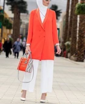اعتمدت العارضة هنا علي بليزر طويل باللون البرتقالى ونسقت معه بنطال أبيض كلاسيكى واسع وحقيبة باللونين الأبيض والبرتقالى وحذاء عالي باللون الأبيض.
