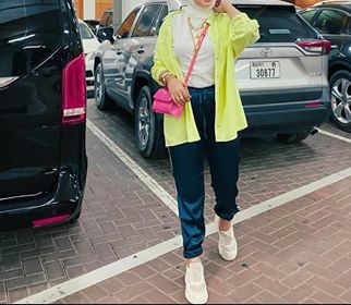 اعتمدت هنا الفاشينيستا علي سويت بانت باللون الكحلى وتوب باللون الأبيض وقميص باللون النيون الجرئ، وزينت الإطلالة بحذاء رياضي باللون الأبيض. يمكنك اعتماد هذا الإطلالة أثناء التسوق أو الخروج مع الأصدقاء المقربين.