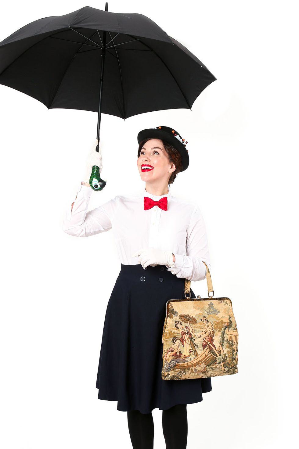 من السهل تقليد مظهر الشخصية الرئيسية في سلسلة أفلام ماري بوبينز والتي كانت تظهر بمظلة وقبعة بولر وبلوزة بيضاء مكشكشة.