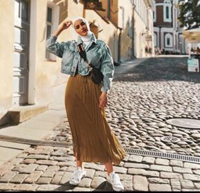 فقد نسقت العارضة هنا الجيبة بطريقة كاجوال رياضي، فقد أرتدت جيبة باللون البيج الداكن واعتمدت معها جاكيت بوى فريند من الجينز القصير، وزينت الإطلالة بحجاب باللون الأبيض وحذاء رياضي أبيض وحقيبة كاجول باللون الأسود.