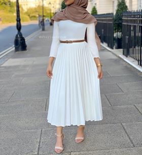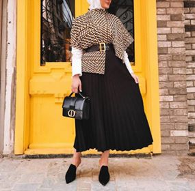 قررت العارضة هنا اعتماد البليسية لتكون قطعة كلاسيكة مميزة وأنيقة، فقد نسقت العارضة هنا التنورة البليسية السوداء واعتمدت علي توب باللونين الأبيض والبنى وحزام خصر باللون الأسود وحجاب باللون الأبيض، واعتمدت على حذاء كلاسيكى باللون الأسود وحقيبة باللون الأسود وبدت في غاية الاناقة، حيث يمكن اعتمد هذه الإطلالة في خروجة مسائية مميزة.