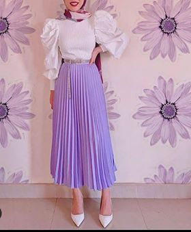 لقد وقعت في غرام تلك الإطلالة كلاسيكية بسيطة وغاية في الأناقة والرقي، فقد اعتمدت العرضة علي تنورة بليسيه باللون الموف، وتوب باللون الأبيض بأكمام منتفخة حزام خصر ألماسى، وينت الإطلالة بحجاب باللون البنفسجى والأبيض وحذاء باللون الأبيض.