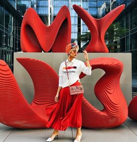 نسقت العارضة هنا الإطلالة بشكل يناسب خروجة سهلة وبسيطة مع الأصدقاء فقد اعتمدت علي تنورة بليسيه باللون الأحمر وتيشيرت باللون الأبيض وزينت الإطلالة بحجاب باللونين الأحمر والأزرق، وحقيبة باللون الأحمر وحذاء أبيض أنيق.