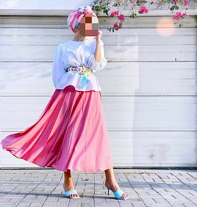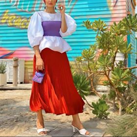 اختارت العارضة هنا ألوان صيفية من الدرجة الاولى فقد اعتمدت علي تنورة بليسية باللون الأحمر وتوب باللون الأبيض وكروب توب باللون الموف وزينت الإطلالة بحذاء أبيض مكشوف وحقيبة صغيرة باللون الموف، ويمكنك اعتماد حجاب يجمع بين اللونين الاحمر والموف.