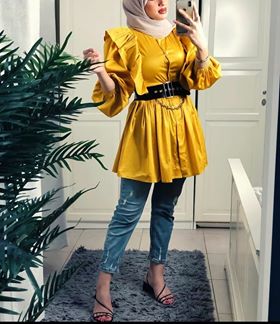 اعتمدت هنا الفاشينيستا علي توب باللون المستردة وحزام خصر باللون الأسود وبنطلون جينز باللون الازرق الفاتح، وزينت الإطلالة بحذاء مكشوف باللون الأسود.