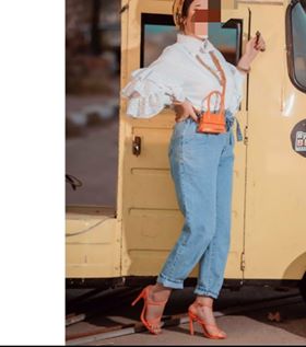نسقت العارضة هنا توب أبيض بأكمام منتفخة مع بنطلون مام فيت باللون الأزرق الفاتح، وزينت الإطلالة بحذاء وحقيبة باللون البرتفالى، واعتمدت حجاب باللونين البرتقالى والاسود، إطلالة بسيطة يمكن اعتمادها في الخروجات مع الأصدقاء نهاراً.