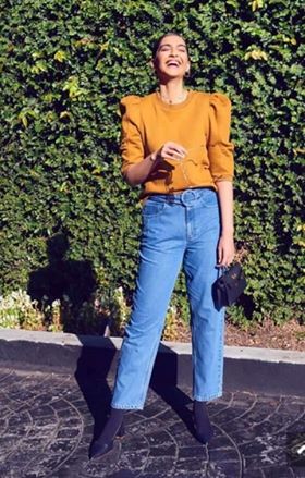 ظهرن سونام ببنطال أزرق من الجينز ذان الرجل الواسع وتوب أصفر بكشكشة من الكتاف ونسقت معه حذاء وشنطة باللون الأسود.