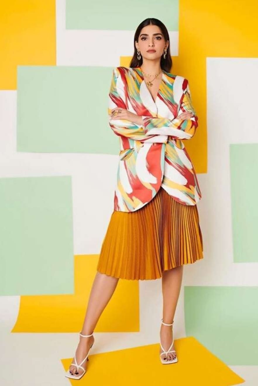 اعتمدت سونام في هذه الإطلالة علي سترة ذات طباعة ملونة وتنورة باللون الذهبي ونسقت معه صندل ابيض، واعتمدت مكياج طبيعى ناعم وشعر منسدل وبدت في غاية الأناقة.