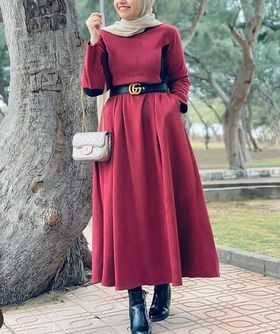 ظهرت هنا العارضة بفستان خريفى باللون الأحمر الداكن، ونسقت معه حزام أسود وحذاء متوسط الطول باللون الأسود، وزينت العارضة هنا الإطلالة بحقيبة وحجاب باللون النيود.