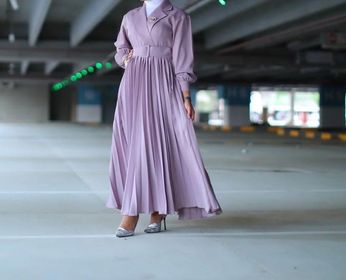 اللافندر! نعم سيدتى هذا اللون الرئاج هذا الموسم، وعلي مايبدوا أنه مستمر معنا في فصل الخريف، ومتوقع وجوده في موسم الشتاء. هنا اختارت العارضة فستان بليسيه باللون اللافندر، ونسقن معه حجاب باللون الأبيض، وحذاء كلاسيكى عالى باللون اللافندر، إطلالة مميزة للغاية يمكنك إعتمادها صباحاً ومستءً.