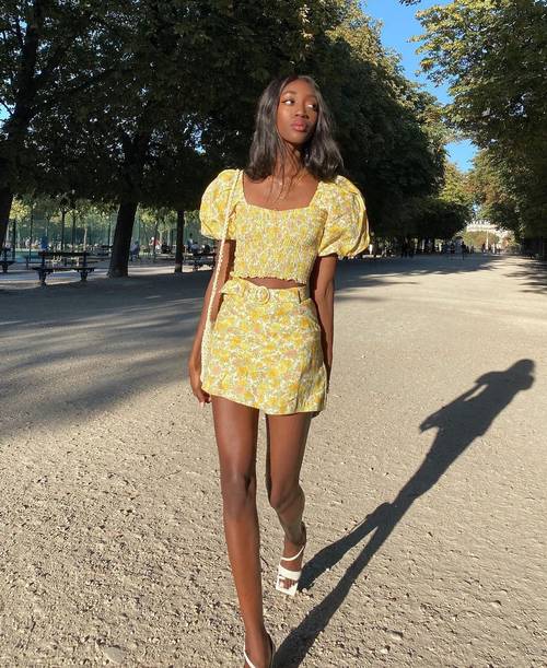 من القطع المميزة لربيع عام 2021 هي تنورات الميني بكافة اشكالها سواء المنقوشة أو البسيطة وهي مناسبة للنزهات على الشاطئ.
