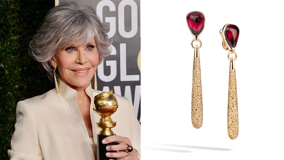 لفتت الممثلة الأميركية جين فوندا الأنظار باقراطها المتدلية الفاخرة من علامة Pomellato الإيطالية وهي مصنوعة من الذهب الوردي عيار 18 ومرصع ب 422 ماسة باللون البني ويعلو الأقراط أحجار الروبليت الحمراء.