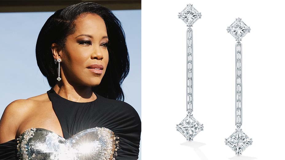 لم تلفت الممثلة الأميركية ريجينا كينغ الأنظار بفستانها الأنيق فقط ولكن ايضاً قطعة مجوهرات مميزة ارتدتها من علامة Forevermark وهو عبارة عن أقراط متدلية مرصعة بقطع الألماس عيار 18.61 قيراط والذهب الأبيض عيار 18.