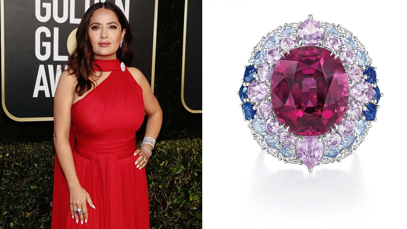 ارتدت الممثلة الشهيرة سلمى حايك خاتم كاندي من مجموعة هاري وينستون للمجوهرات بوزن 9.07 قراط ويتميز الخاتم بوجود حجر الروبليت الأحمر الداكن في منتصفه.