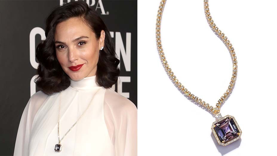 ارتدت الممثلة جال غادوت عقداً مميزاً طراز 18 قيراط من الذهب الأصفر من مجموعة Tiffany & Co ويتميز العقد بوجود حجر الزوسيت ثنائي اللون والذي يتغير مع اتجاه الرؤية و يحاوطه قطع صغيرة من الماس الباغيت ويزين العقد بكامله ما يقرب من 1000 ماسة براقة.