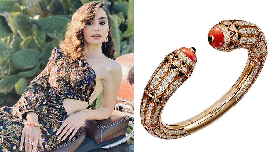 اعتمدت الممثلة الأميركية من أصول بريطانية ليلي كولينز العلامة التجارية كارتييه وارتدت سوار مميز عيار 18 قيراط مصنوع من عدة أحجار مميزة مثل المرجان الأحمر والعقيق والأحجار المطلية بالاسود والسوار كان ايضاً مرصع بقطع الألماس والذهب الوردي.