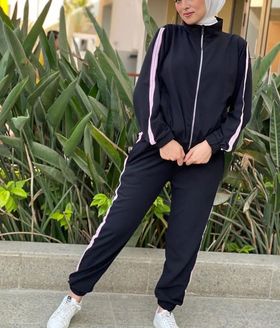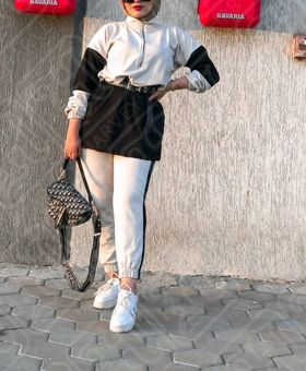 اختارت هنا العارضة بدلة كاملة باللون الأسود دع خط جانبي باللون البينك ونسقتت معه حذاء رياضي باللون الأبيض وحجاب باللون الأبيض وبدت في غاية الأناقة.