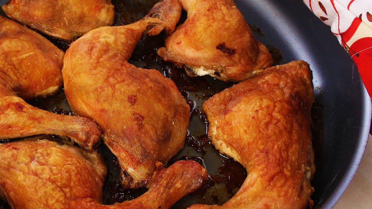 3- ضعي أفخاذ الدجاج في صينية فرن واطهيها لحوالى 40 دقيقة، مع تقليبها بين الحين والآخر، حتى تتحمّر من كل الجهات.