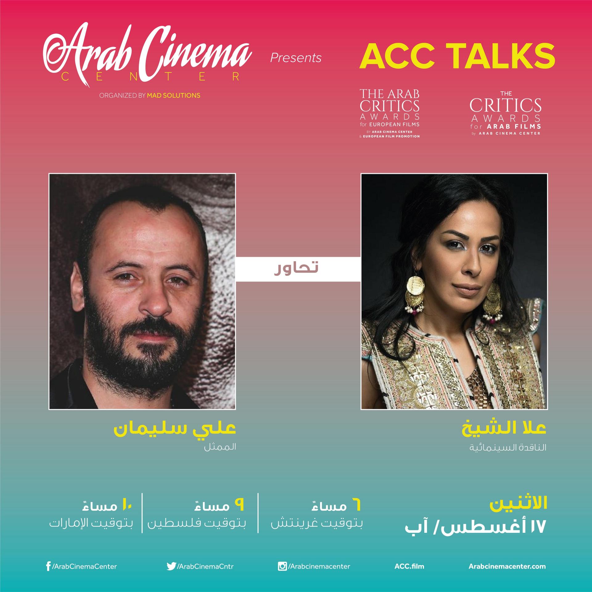 يحل النجم الفلسطيني العالمي علي سليمان ضيفاً على الحلقة المقبلة من لقاءات مركز السينما العربية على انستغرام، وسوف تدير الحوار معه الناقدة علا الشيخ يوم الخميس 20 أغسطس/ آب الساعة 6 مساءً بتوقيت غرينتش عبر الصفحة الرسمية لـمركز السينما العربية على انستغرام.