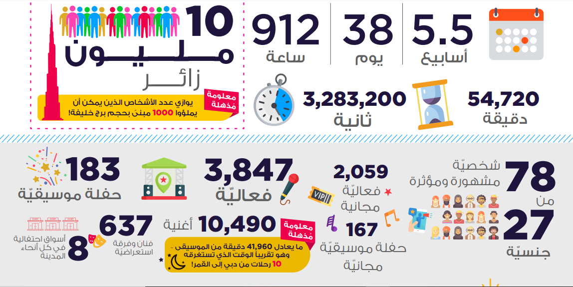 وحضر فعّاليات مهرجان دبي للتسوّق، بما فيها الفعّاليات الترفيهية وأنشطة العلامات التجارية وأسواق المهرجان والحفلات الغنائية وغيرها، أكثر من 10 مليون على مدى 38 يوماً – 912 ساعة و54،720 دقيقة و3،283،200 ثانية.