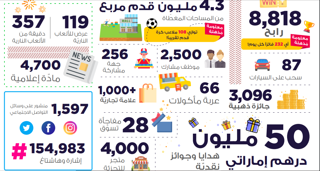 وحقق المهرجان هذا العام أرقامًا مذهلة جعلته في مصاف مهرجانات التسوّق الأكبر في العالم، حيث شهد الحدث خمسة أسابيع من التخفيضات، و38 يومًا من الفعّاليات، و912 ساعة من الصفقات والحفلات والفعّاليات والتجارب الاستثنائية
