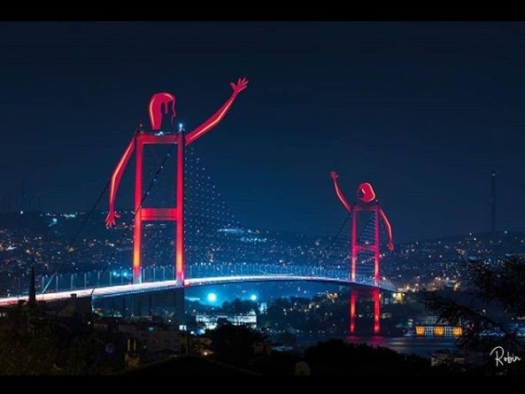 رسم المصمم التركي والمقيم في مدينة ميلانو الإيطالية "روبن يايلا"، صورة تُعبر عن التباعد الاجتماعي على جسر البوسفور المعروف رسميًا باسم جسر شهداء 15 تموز، وذلك لحث المواطنين على التزام مسافة الأمان في الأماكن العامة، في إطار إجراءات الوقاية من فيروس "كورونا".