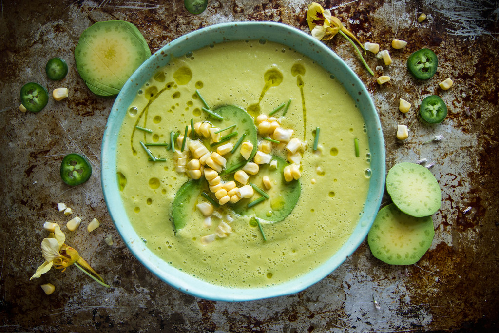 5- قطعي الأفوكادو بخشونة في وعاء، وضعيها على طبق الشوربة وزينيها بالكزبرة.