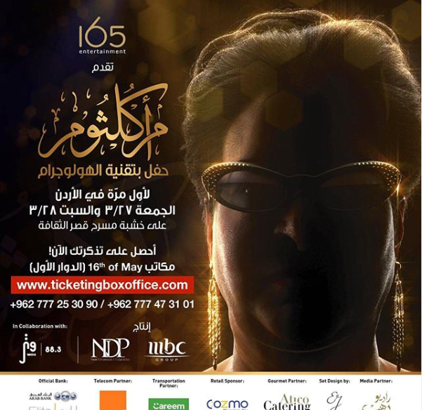 ينظم مسرح قصر الثقافة في العاصمة الأردنية عمان الحفل الأول لكوكب الشرق أم كلثوم بتقنية الـ "هولوغرام" من إنتاج مجموعة MBC و NDP للإنتاج الفني.