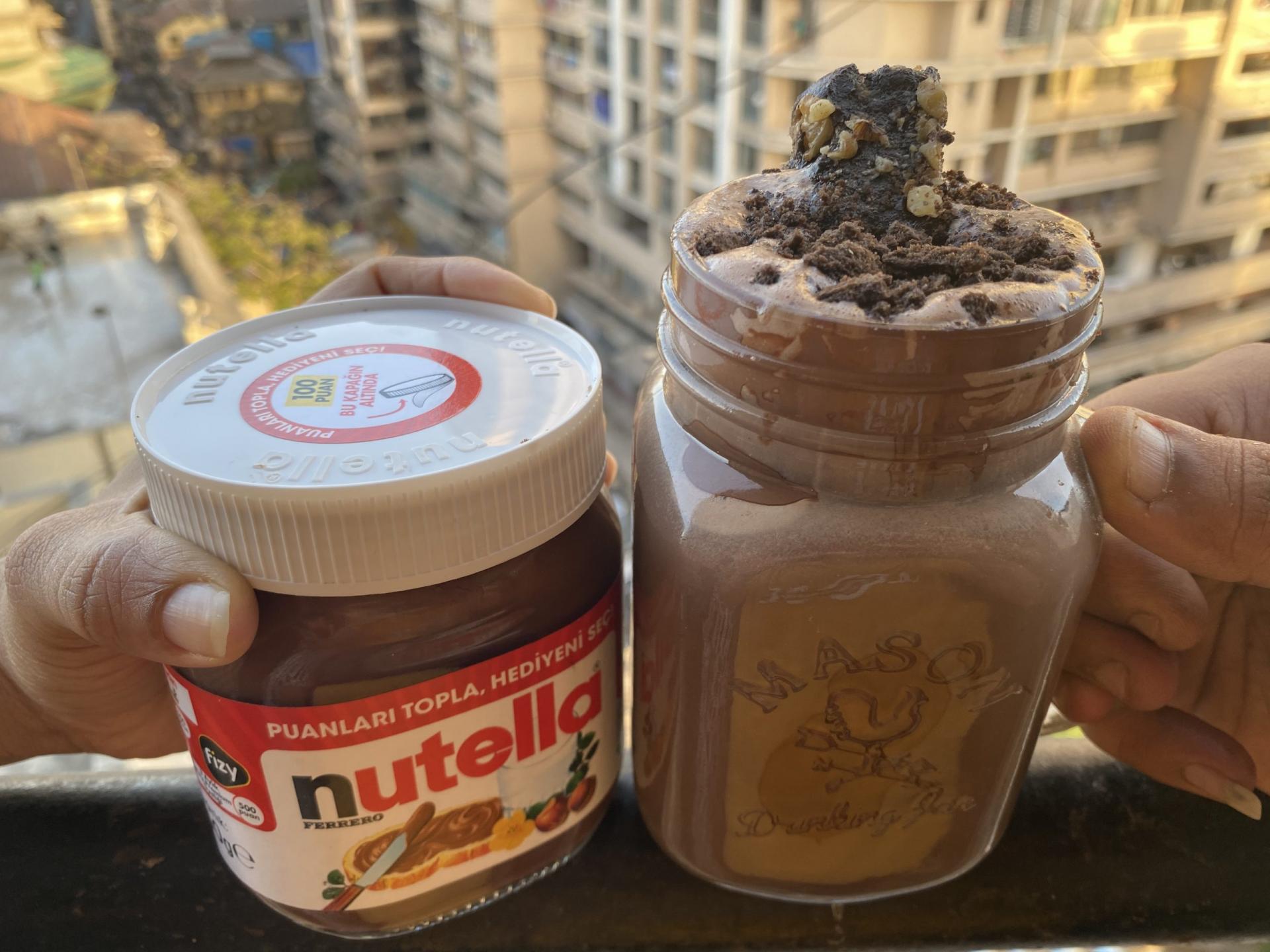 1- في الخلاط الكهربائي، ضعي الحليب، شوكولاتة النوتيلا والثلج.