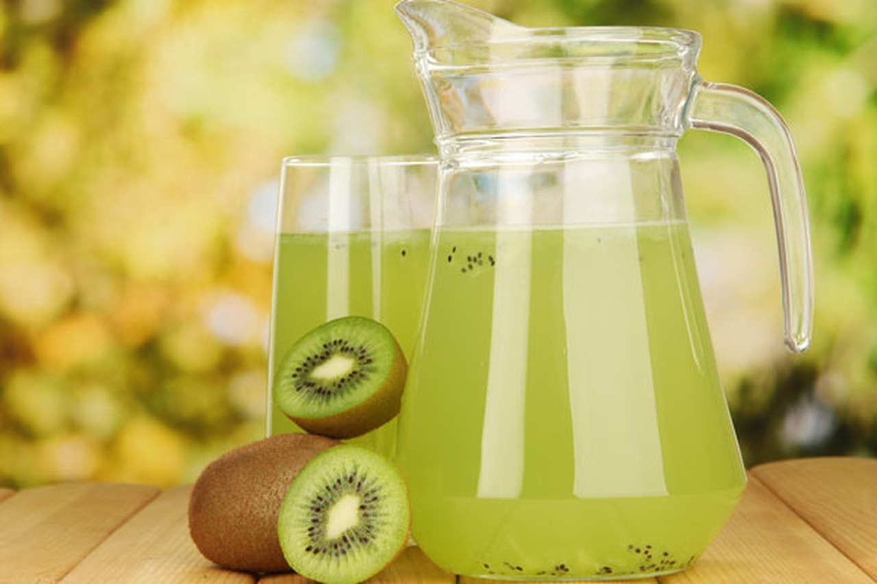 نسكب العصير في كاسات ثم يتم تزينه في قطعة كيوي.
