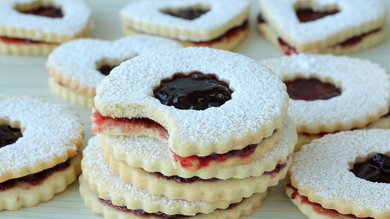 11- ضعي على القطعة الكاملة مقدار ملعقة من مربى المشمش أو الفرولة ثم غطّيها بقطعة بسكويت مفرّغة.