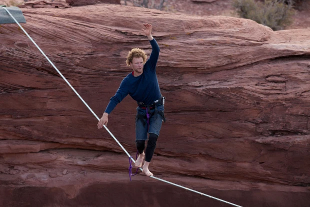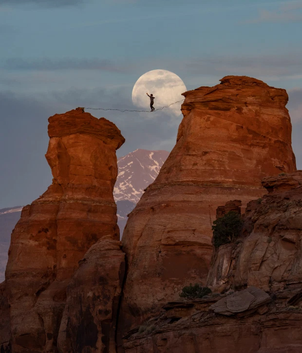قام آندي لويس، المتسلق المحترف بتأدية عرض الموت وهو المشي على حبل رفيع بين صخرتين وخلفه مشهد كبير للقمر وبدا العرض وكأن لويس يمشي على القمر.