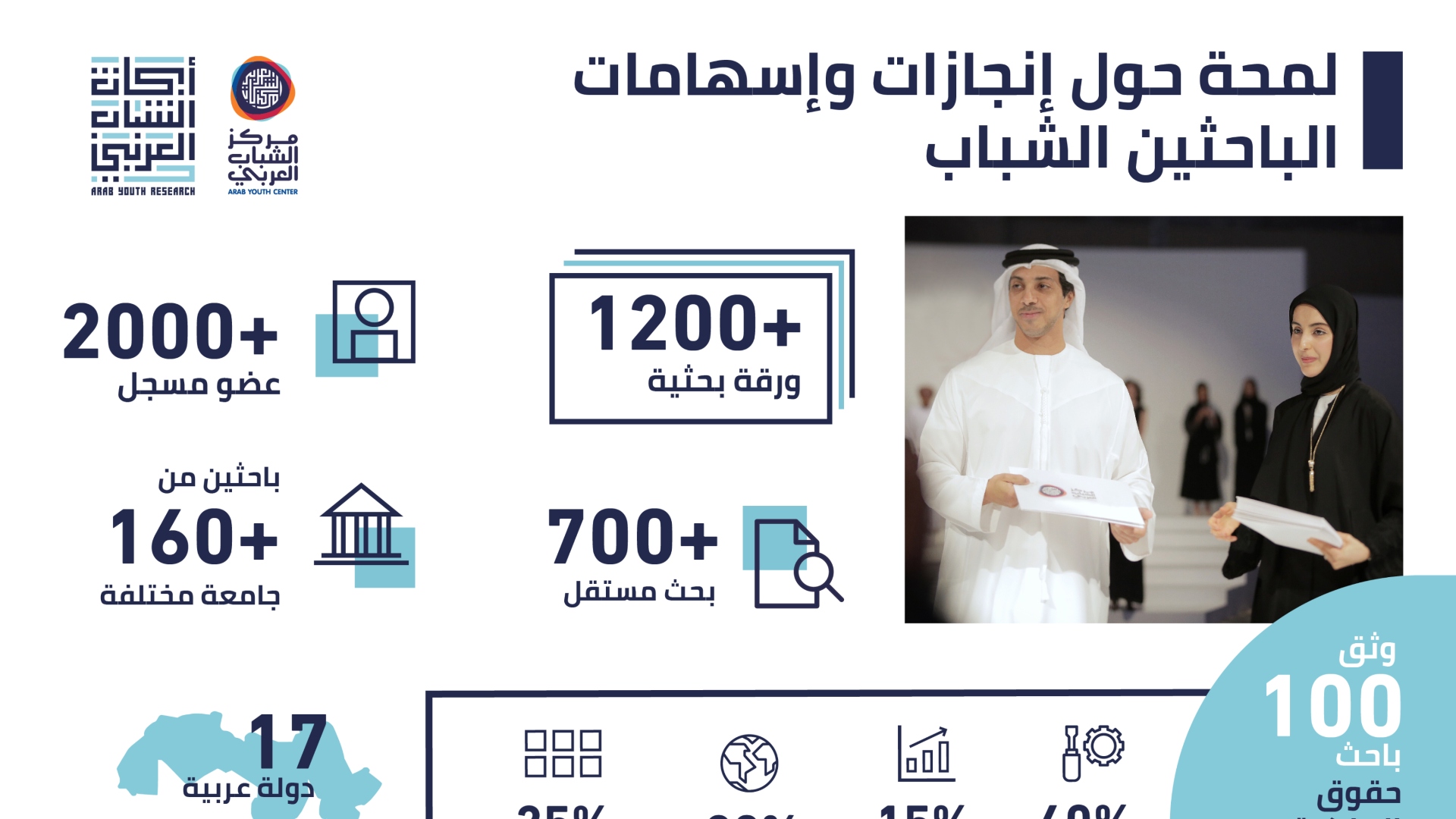 وتأتي هذه الخطوة بعد الإقبال الواسع من جانب الباحثين الشباب على نشر أبحاثهم في مختلف الاختصاصات عبر "منصة أبحاث الشباب العربي" التي أطلقها مركز الشباب العربي عام 2019، لتضم حتى الآن أكثر من 2000 عضواً مسجلاً، وتضع في متناول الشباب العربي 1181 ورقة بحثية من إعداد الشباب حيث استقبلت المنصة أوراق بحثية من مختلف المجالات أكثرها في الهندسة والعمارة والطب والعلوم البيئية والاقتصاد من 162 جامعة وكلية يمثلون 17 دولة عربية. بالإضافة إلى التعاون مع الهيئة الاتحادية للتنافسية والإحصاء في دولة الإمارات التي قامت بمنح 100 باحث عربي شاب حقوق الملكية الفكرية لأبحاثهم.