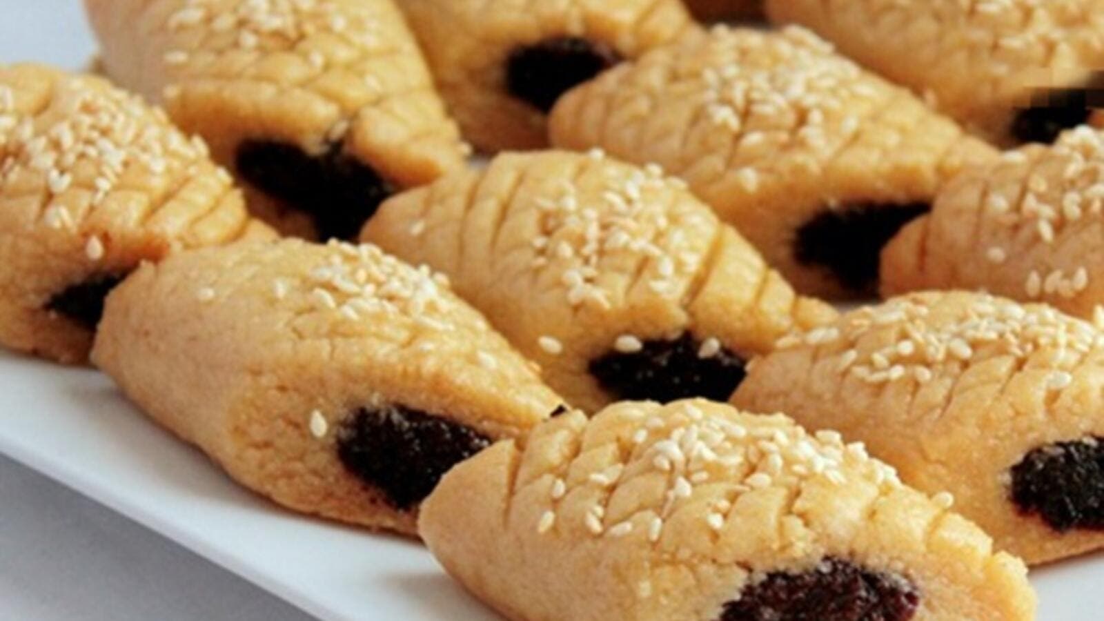 تفرد العجينة على لوح مرشوش بالدقيق وتقطع مستطيلات على شكل شرائط بعرض 7 سم وضعي حشوة التمر ولفي على شكل اسطوانة.