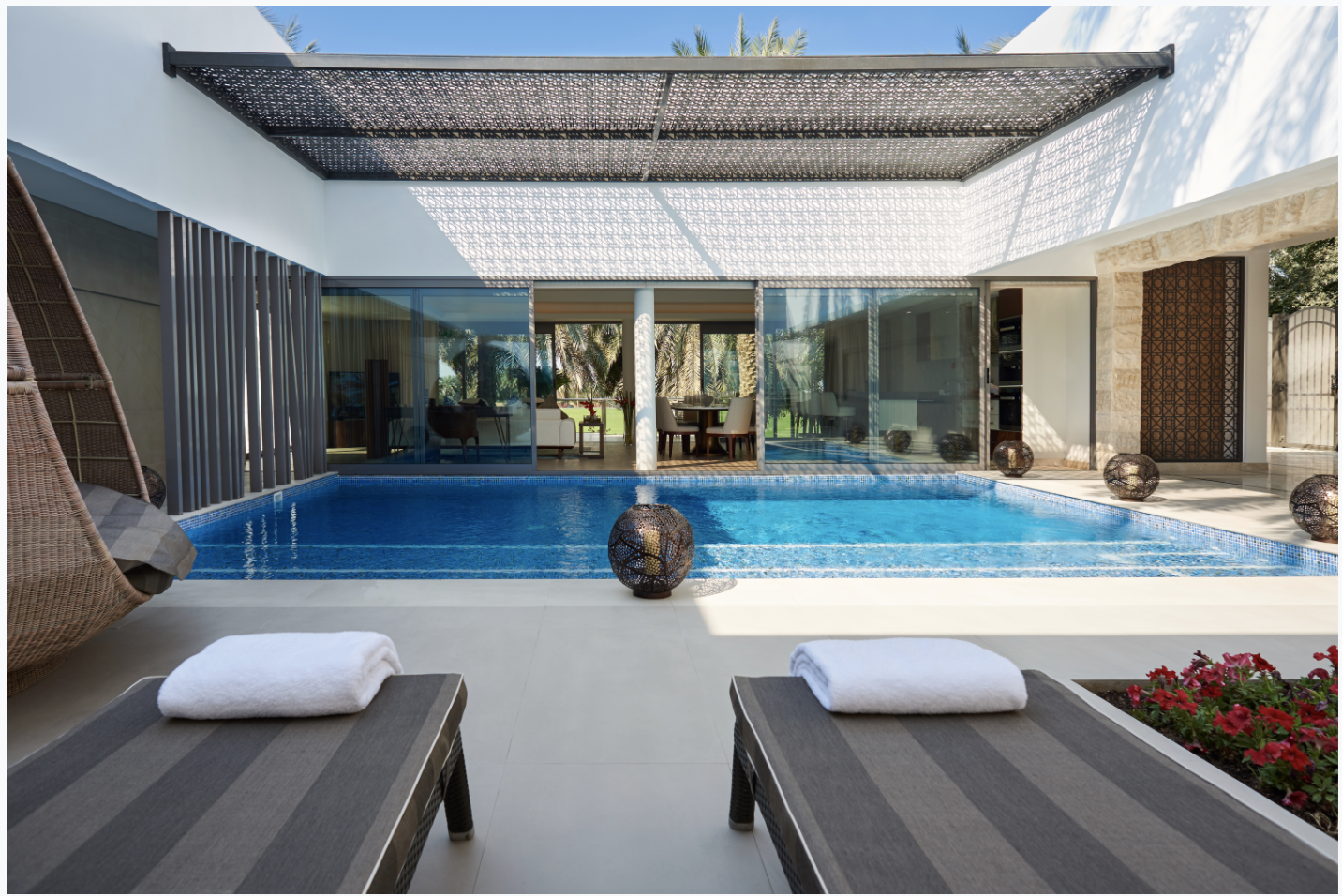 يقدم موقع المنتجع ملاذا هادئا وسط حقول البولو الخضراء الخصبة، ما يجعله المكان المثالي للاسترخاء أو موقعا ساحرا لحفلات الزفاف. يحتفي ميليا ديزرت بالم كذلك بالفلل الفخمة التي تحتوي على مسابح خاصة، موفرة بذلك خصوصية مطلقة لإقامة مجددة للحيوية.