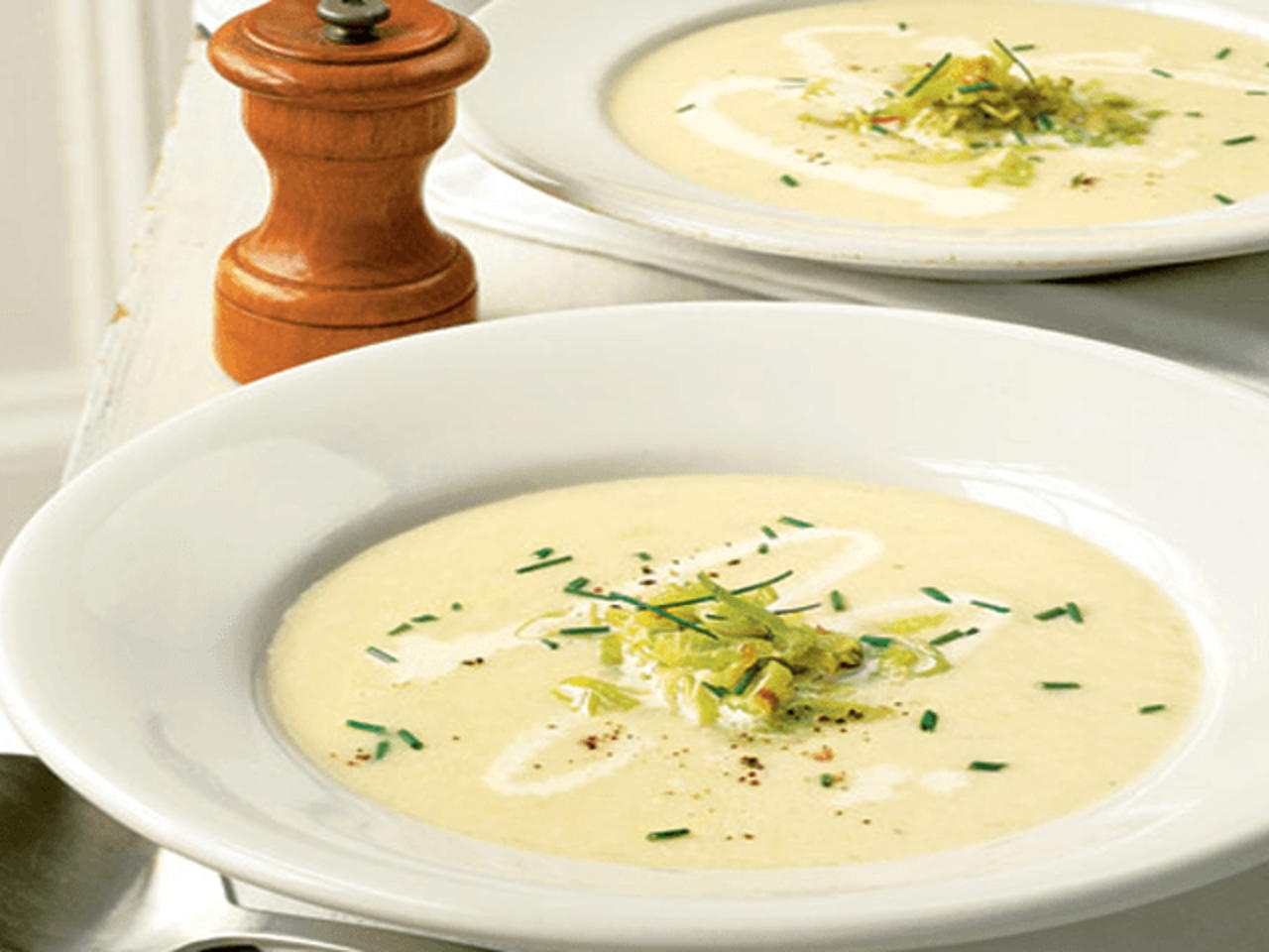 1- في قدر على نار متوسطة ذوبي الزبدة واسكبي الزيت ثم قلي البصل، الكراث والبطاطس.