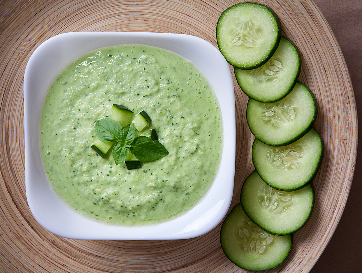 1- قشري الخيار واقطعيه طولياً لنزع اللب ثم قطعيه إلى مكعبات كبيرة.
