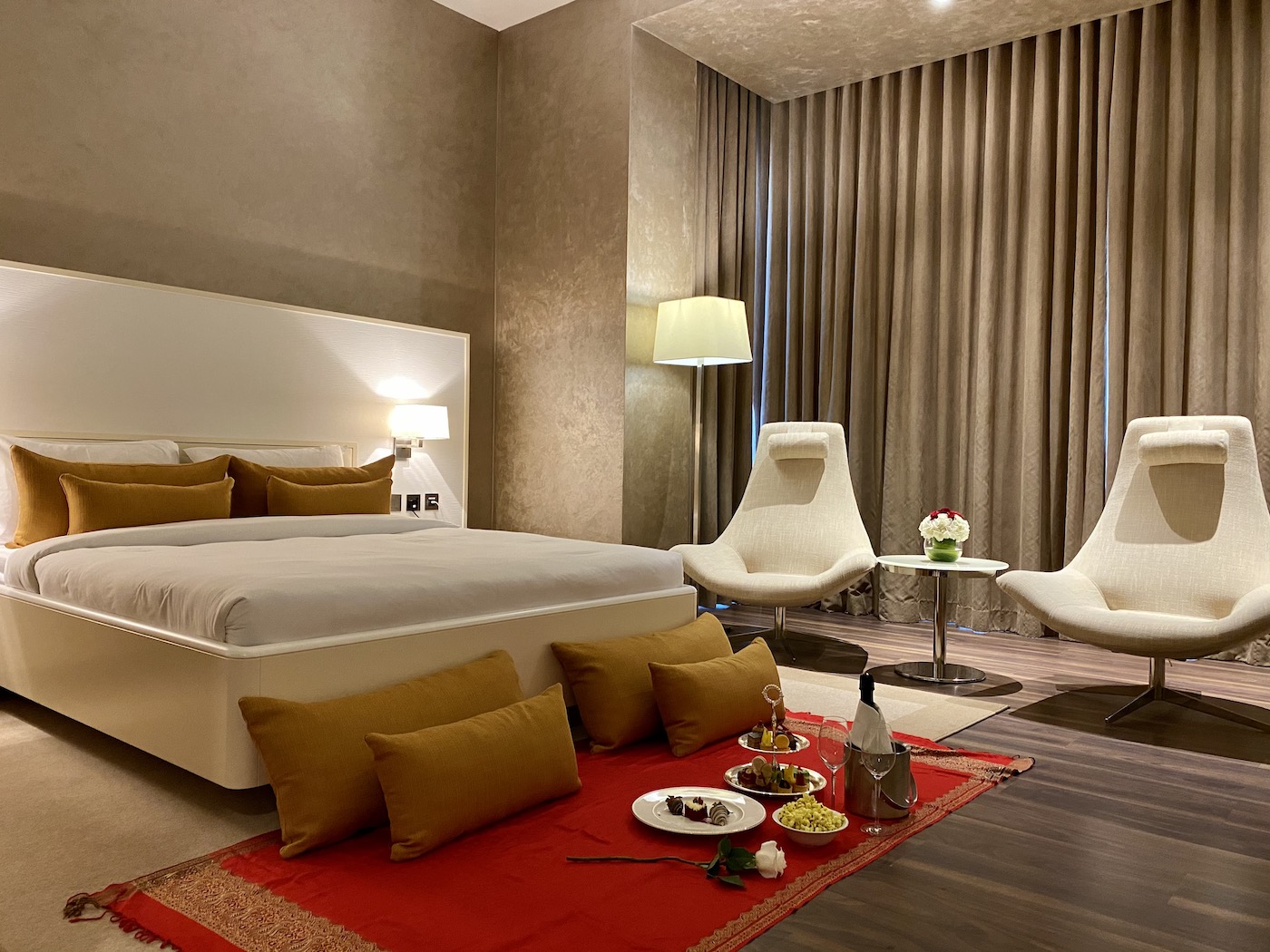 وتشمل الإقامة أيضاً وجبة مكوّنة من 4 أطباق شهية، ليستمتع بها الضيوف في راحة غرفهم، حيث سيتسنى للضيوف الاختيار بين السلمون المدخن مع الوسابي ا أو سلطة الكابريس ويليها حساء مينيستروني أو حساء سرطان البحر. وتشمل الأطباق الرئيسية سمك السلمون النرويجي مع الهليون وصلصة البيرنيز، ريزوتو السي فود أو طبق اللحم مع الفطر والبصل المكرمل. وتضيف كعكة الريد فيلفيت أو تارت الفواكه اللمسة النهائية والمثالية للوجبة. التجربة بأكملها بسعر 600 درهم في الليلة شاملة وجبة الإفطار والضرائب.