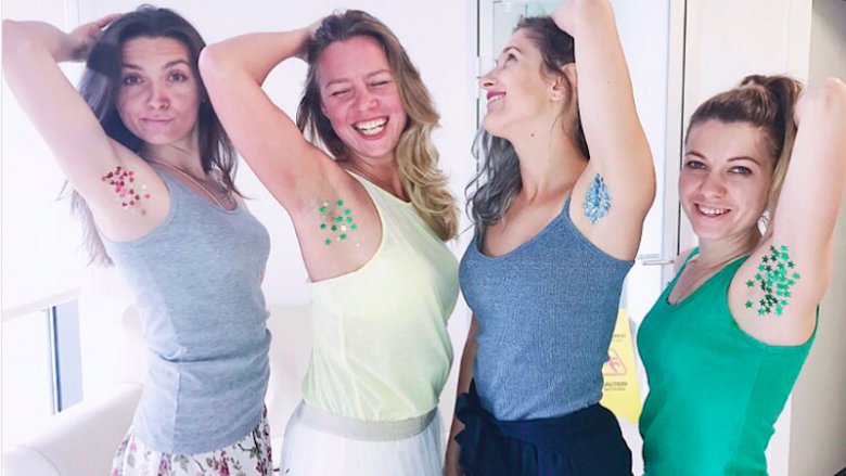 تميل بعض السيدات لوضع الجليتر على الوجه او الجسم ولكن هذه المرة وصلت الموضة إلى وضع الجليتر الملون على منطقة الإبطين وانتشرت هذه الموضه الغريبة لفترة كبيرة من الوقت في عام 2019.