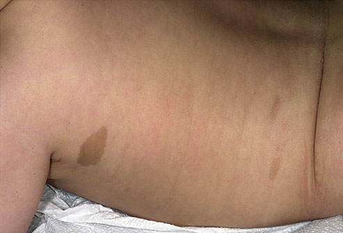 بقع ناعمة وبيضاوية ويتراوح لونها من البني الفاتح إلى المتوسط ، . توجد عادة على الجذع والأرداف والساقين. قد تصبح أكبر وأكثر قتامة مع تقدم العمر، ولكنها لا تعتبر مشكلة بشكل عام.