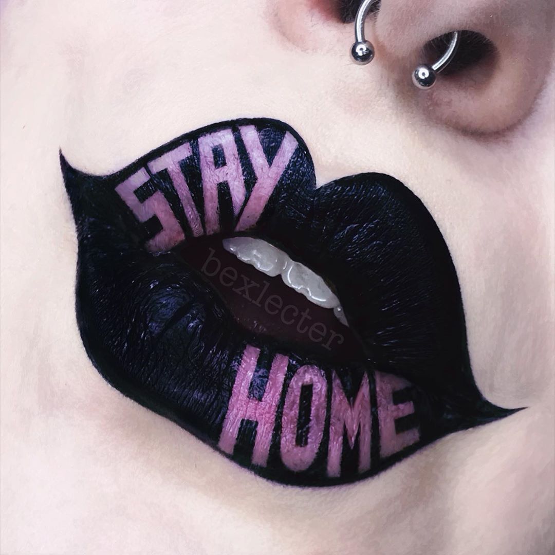 قدمت خبيرة التجميل Bex Lecter على انستجرام ألوان غريبة للغاية حيث استخدمت اللون الأسود، مع كتابة عبارة "ابق بالمنزل" باللون الوردي.