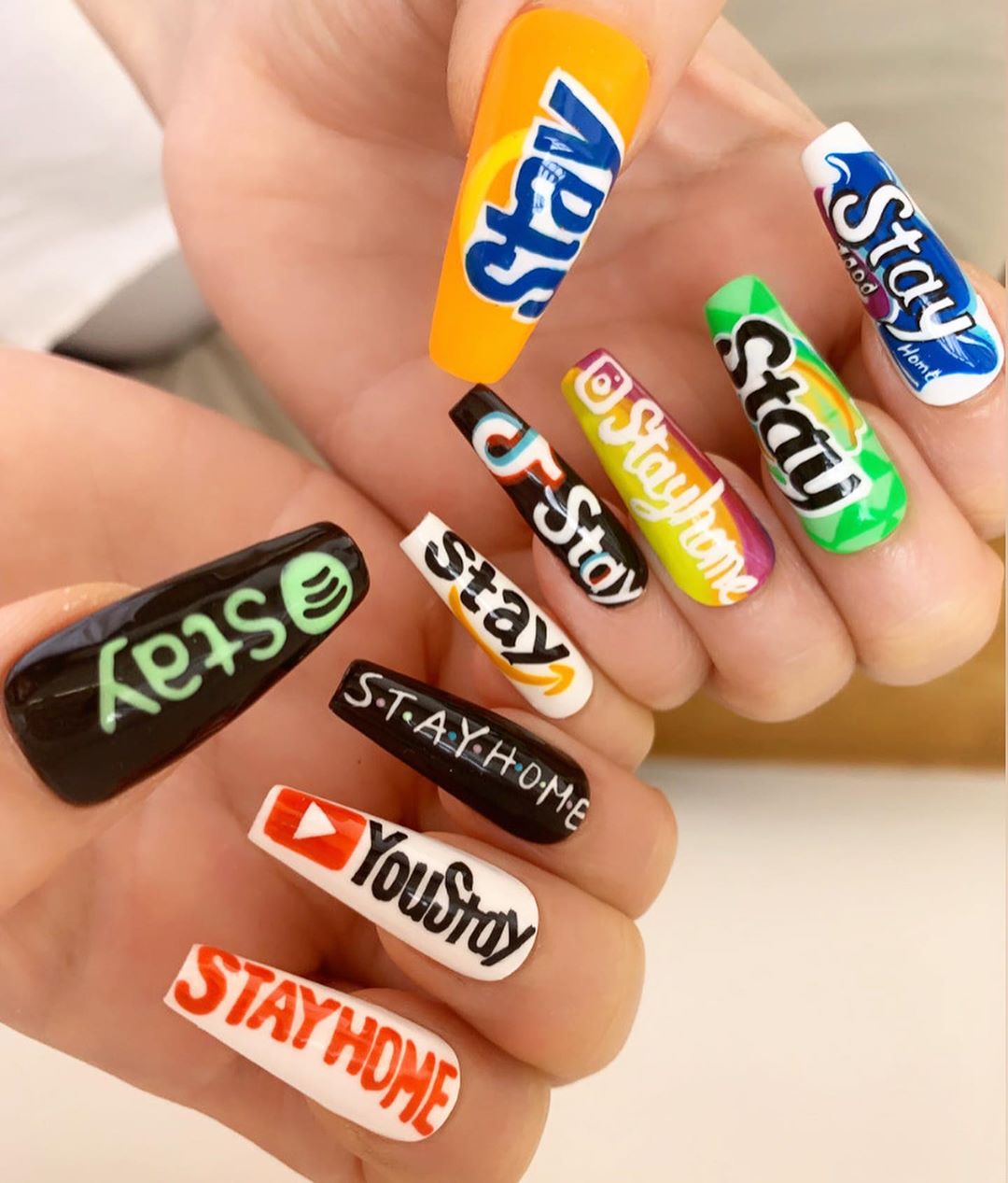 ومن الصيحات الحديثة لمانيكير الأظافر مانشره موقع "Allure" حيث يتم طلاء الأظافر بألوان مختلفة مع كتابة شعارات لتطبيقات ومواقع ويب وأسماء مستلزمات تنظيف المنزلية أوالبرامج التلفزيونية والتي يمكن أن تبقيك مشغولًا أثناء فترة العزل بالمنزل.