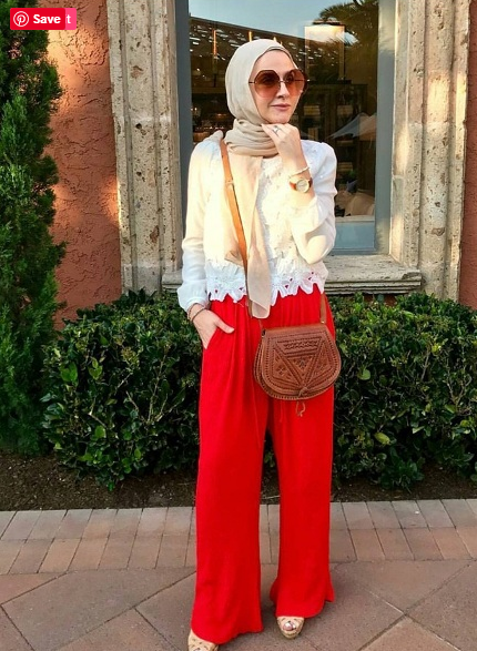 يأتي البنطلون البالازو أو الواسع من القطع اللا غنى عنها للمحجبات، وهذه المرة يطغي عليه الألوان الزاهية التي تتسم بروح الربيع، مثل الأحمر ودرجات الوردي وغيره من ألوان حيوية جنبًا إلى جنب مع درجات النيود أيضًا.