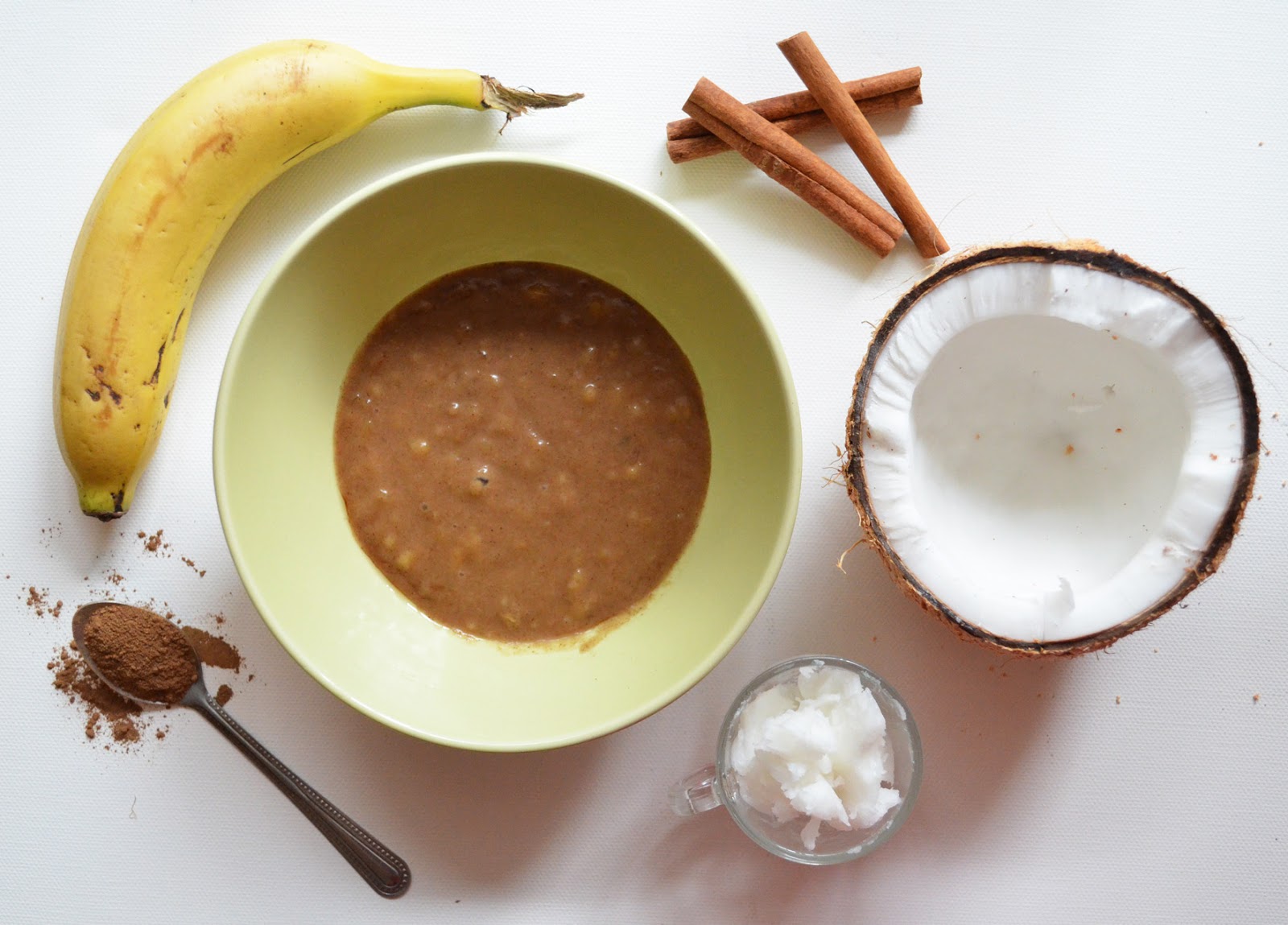 - أولاً نهرسُ حبّة الموز جيّدًا، ونُضيف زيت جوز الهند، وحليب جوز الهند.