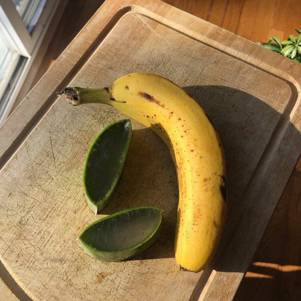 - نستخرجُ اللبَّ من ورقة الصبّار، ونضع اللبَّ مع الموز في الخلّاط.