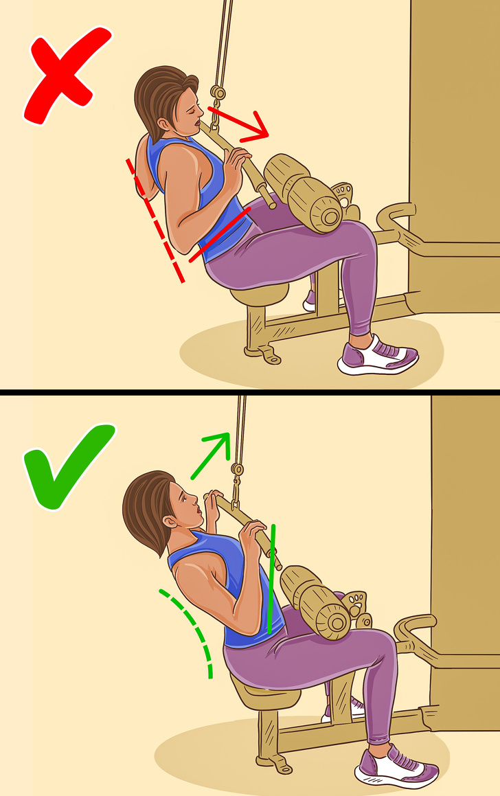 الأخطاء الأكثر شيوعًا التي تحدث أثناء القيام بتمارين السحب للخلف هي سحب المقبض لأسفل الصدر، وترك الكوعين يتحركان خلف الظهر، أو وضع المقبض خلف رقبتك، أو مباعدة ذراعيك بشكل كبير.