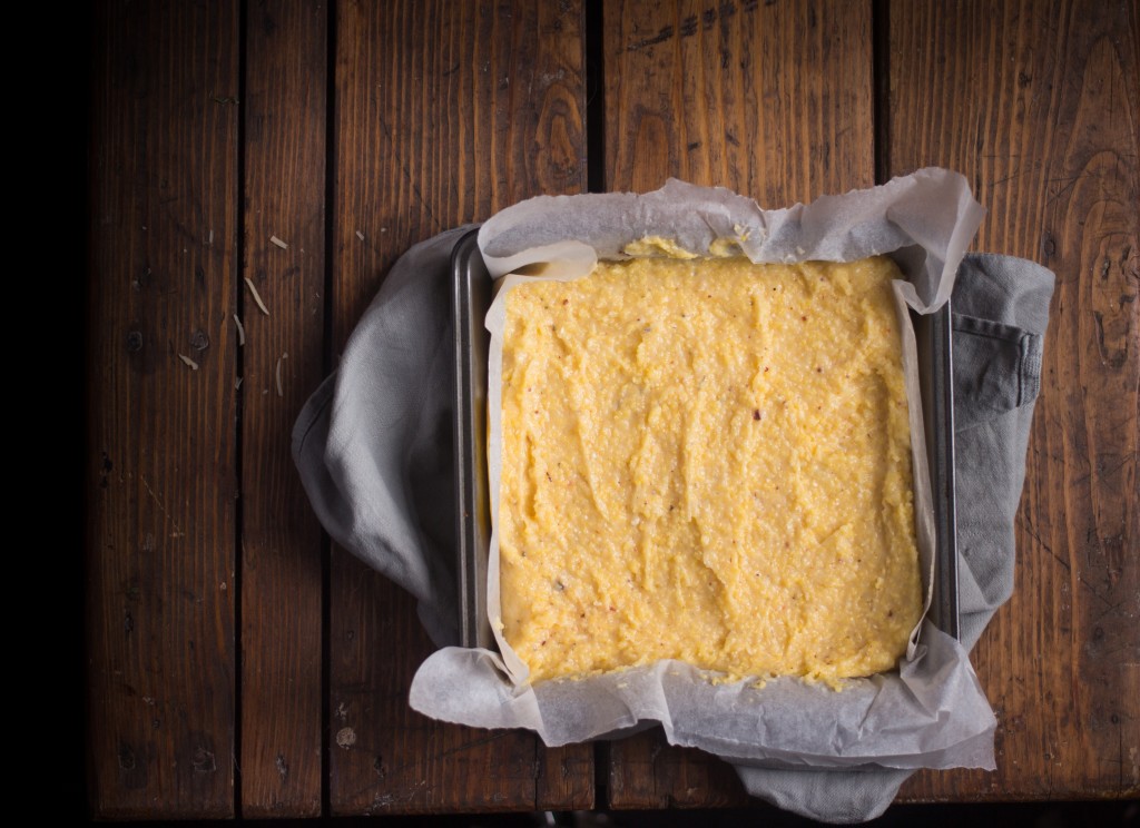 طريقة التحضير: سخني الفرن على درجة حرارة 230 درجة مئوية، قطعي العصيدة إلى شرائح سميكة 8*2 سم، ثم ادهني الشرائح بزيت الزيتون، وضعي الشرائح في الفرن في صينية لمدة نصف ساعة حتى تنضج، ثم ضعي عليها قطع من الجبنة.